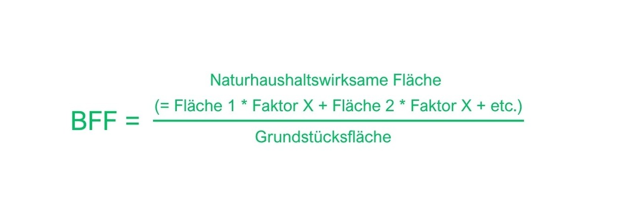 Die generelle Formel der Berechnung des Biotopflächenfaktors lautet BFF = naturhaushaltswirksame Fläche geteilt durch die Grundstücksfläche. Dabei werden die unterschiedlichen Flächenarten eines Grundstücks hinsichtlich ihrer Wirkung auf den Naturhaushalt mit einem Anrechnungsfaktor zwischen 0,0 bis 1,0 bewertet und dann multipliziert. Dabei gilt, je höher der Anrechnungsfaktor, desto positiver die Bewertung der Fläche. Versiegelte Flächen werden z.B. mit 0,0 bewertet, während Vegetationsflächen mit hohem Bedeckungsgrad und Anschluss an den Boden ohne Einschränkung des Wurzelraums die höchste Bewertung 1,0 erhalten. Dazwischen finden alle weiteren Flächenarten ihre Bewertungen, z.B. teilversiegelte Flächen (0,3) oder wandgebundene Vertikalbegrünung (0,7) oder auch regenwassergespeiste Wasserflächen (0,5), (s. Tabelle). Die Summe der auf diese Weise ermittelten Einzelflächen geteilt durch die Grundstücksfläche ergibt dann den BFF.